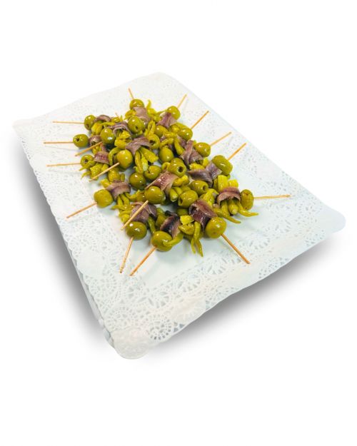 Nuestra Bandeja de 18 Brochetas de Auténtica Gilda y Anchoa ofrece una selección de este clásico vasco en miniatura, perfecto para aperitivos y celebraciones. Cada brocheta está elaborada con ingredientes de alta calidad, combinando el sabor intenso de la anchoa con el toque picante de la guindilla y la frescura de la aceituna.