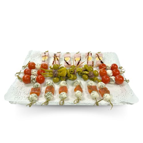 Nuestra Bandeja de 24 Brochetas es una opción ideal para quienes buscan sorprender a sus invitados con una variedad de sabores cuidadosamente seleccionados. Cada brocheta es una pequeña obra de arte culinaria, diseñada para deleitar el paladar y estimular la vista.