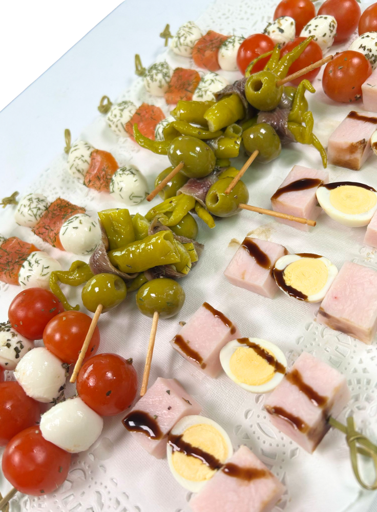 Brochetas de mozzarella, cherry y albahaca: Un clásico italiano, fresco y ligero, perfecto para cualquier ocasión.