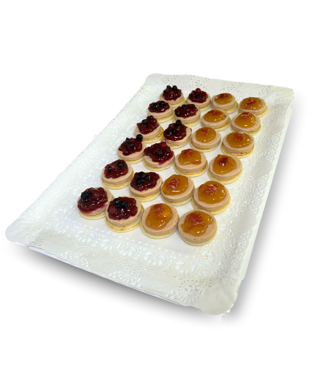12 unidades con mermelada de frutos rojos: El dulzor de la mermelada realza el sabor intenso del foie.