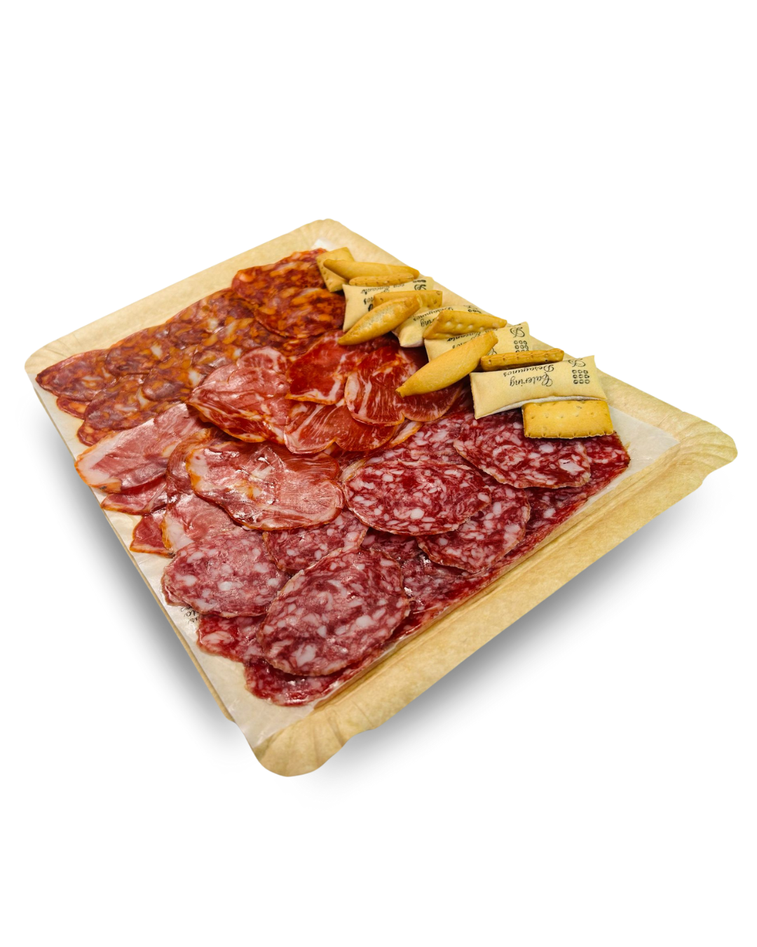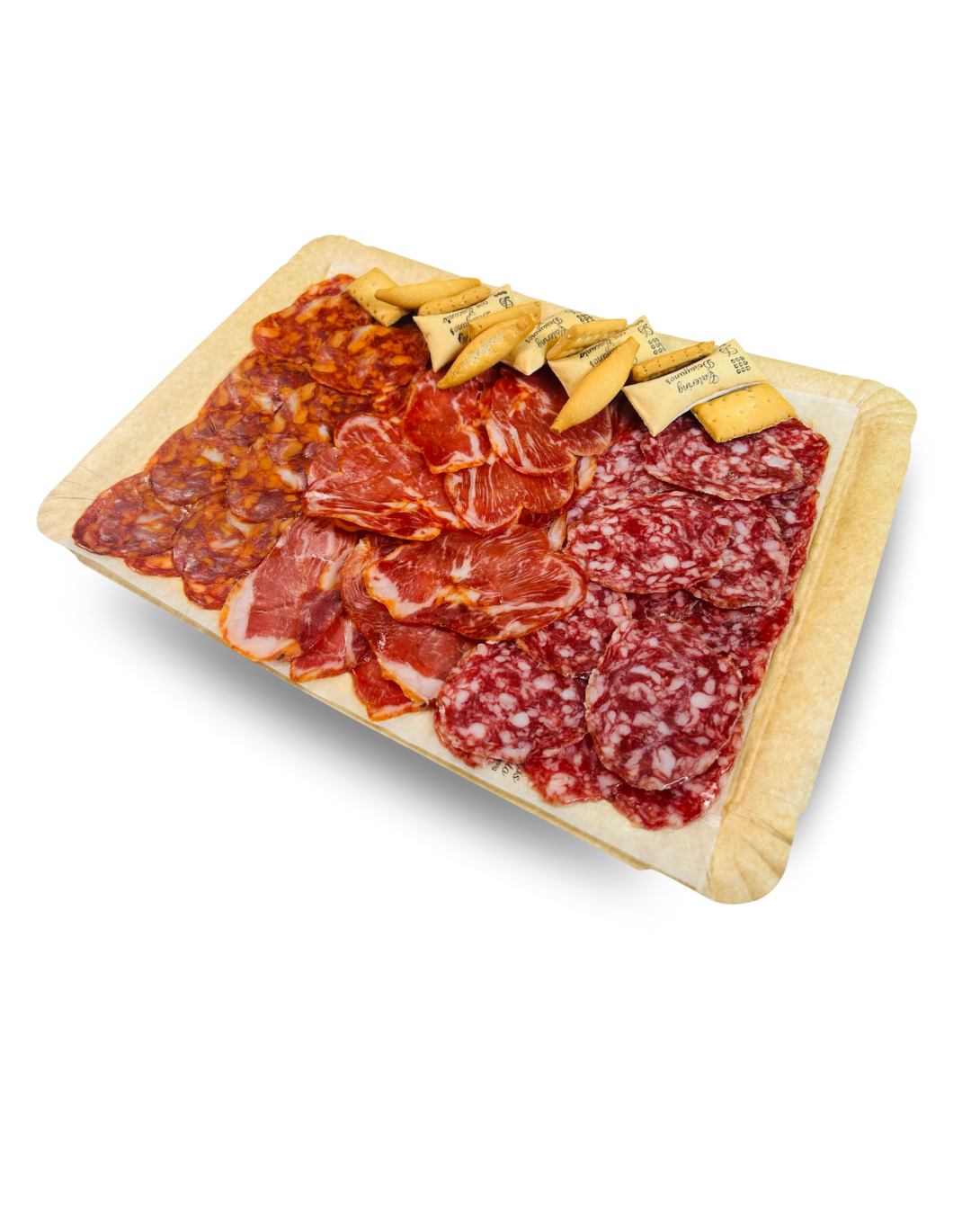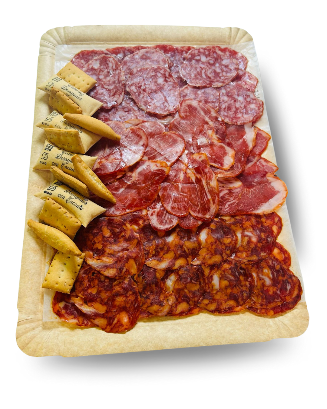 Acompañamiento: La bandeja se completa con picos crujientes, ideales para acompañar y disfrutar al máximo de estos deliciosos embutidos.