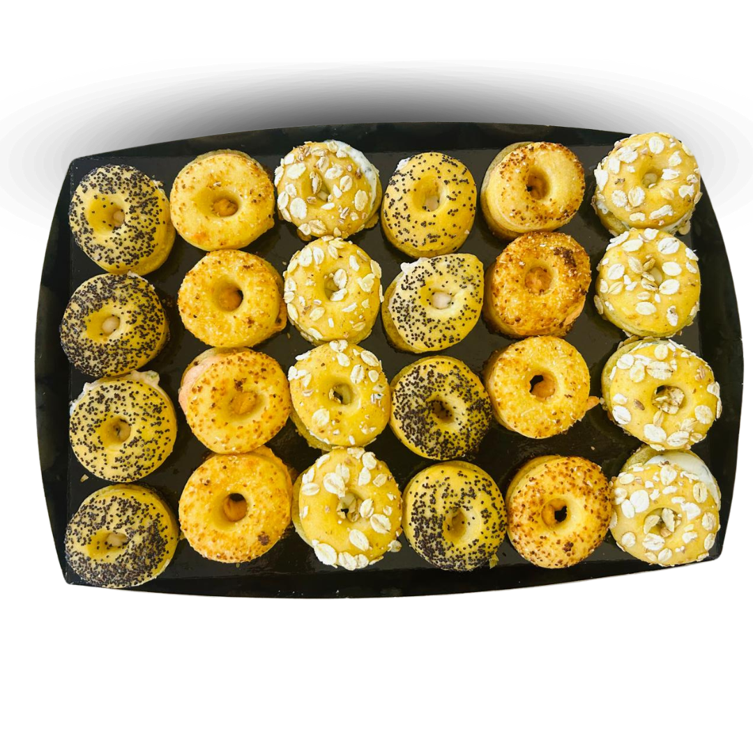 24 mini bagels variados, perfectos para servir como aperitivo o merienda.