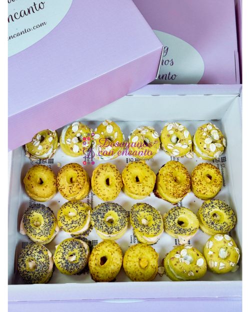 24 mini bagels variados, perfectos para servir como aperitivo o merienda.