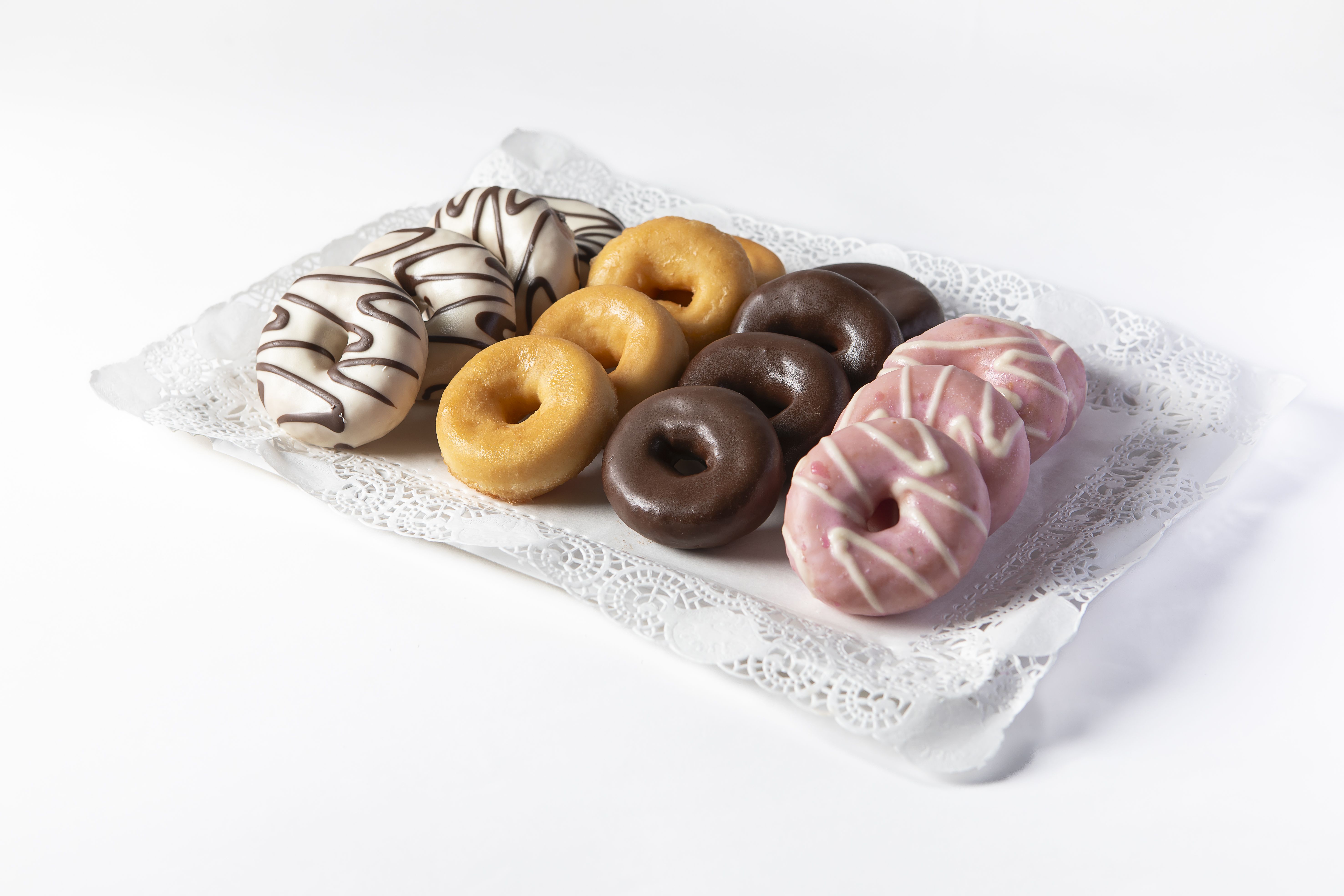 Nuestra Nuestra Bandeja de 16 Mini Hoops ofrece una variedad de mini donuts en cuatro deliciosos sabores, perfectos para endulzar cualquier evento.es el complemento ideal para añadir un toque dulce y divertido a tu evento. Estos mini donuts, presentados en una variedad de sabores y colores, son perfectos para satisfacer a los más golosos.