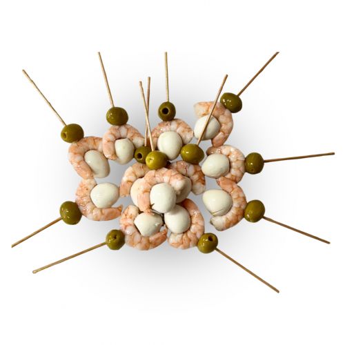 10 Brochetas Bilbainitos, un aperitivo tradicional que combina langostino, huevo de codorniz y aceituna. Sabor intenso y listo para servir en cualquier evento.