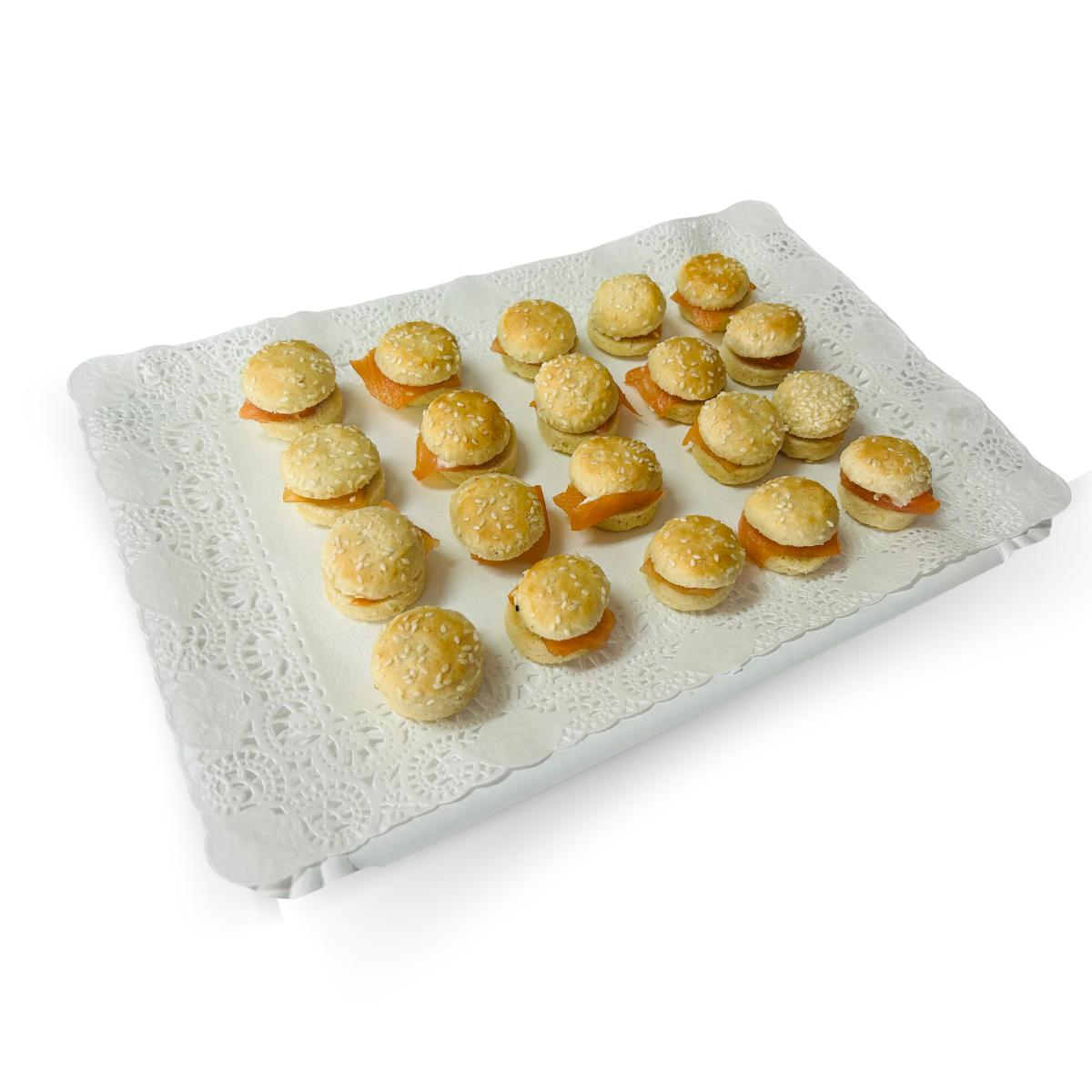 20 Brioche de Salmón y Queso, un aperitivo gourmet que destaca por la frescura del salmón y la cremosidad del queso. Perfectas para cócteles y reuniones elegantes.