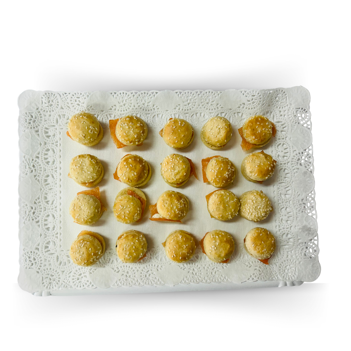 20 Brioche de Salmón y Queso, un aperitivo gourmet que destaca por la frescura del salmón y la cremosidad del queso. Perfectas para cócteles y reuniones elegantes.