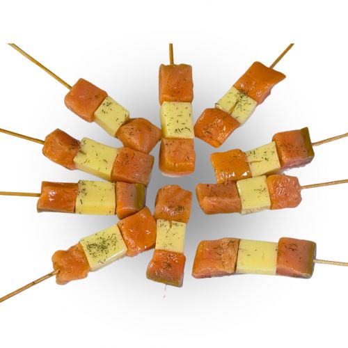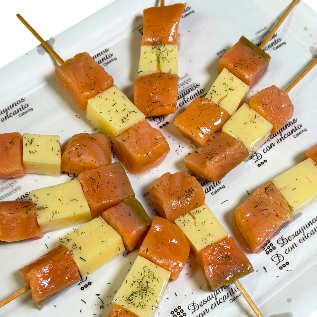 10 Brochetas de Salmón y Queso, elaboradas con salmón ahumado y queso fresco cremoso. Un aperitivo nórdico, fresco y elegante, ideal para servir en cualquier ocasión.