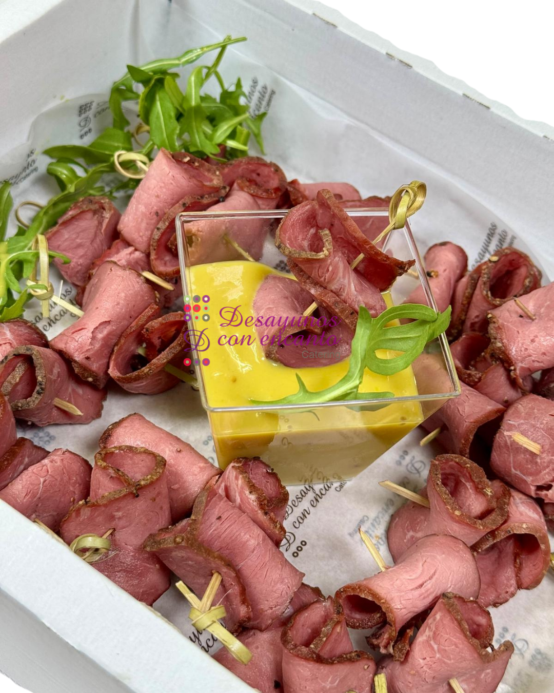 18 Brochetas de pastrami aderezado con con mostaza y miel