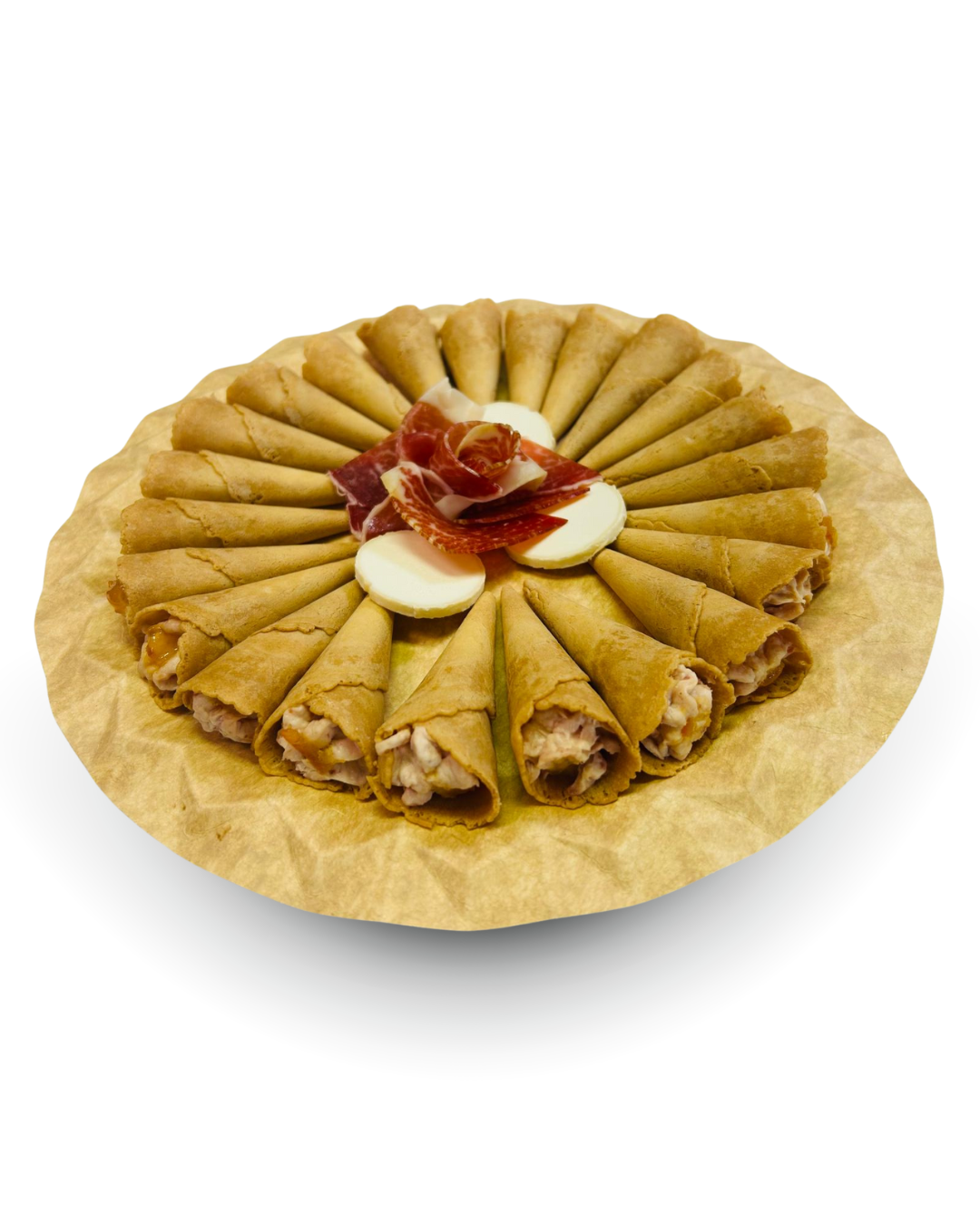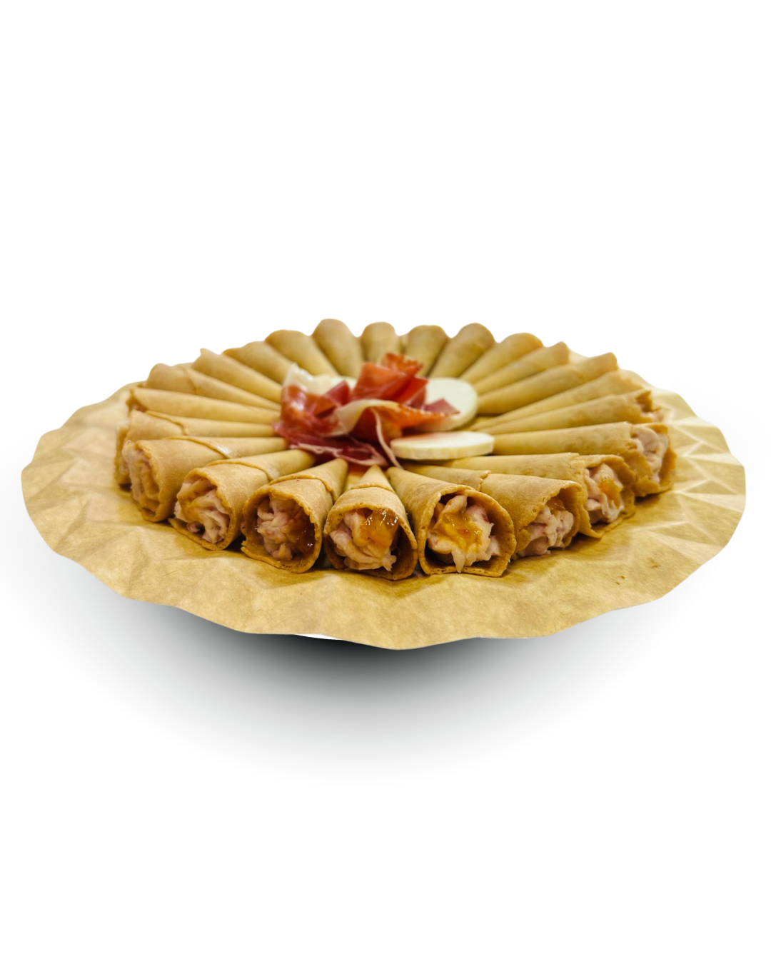 24 unidades de conos crujientes rellenos de mousse de jamón ibérico y mermelada de naranja. Un aperitivo gourmet ideal para eventos y celebraciones.