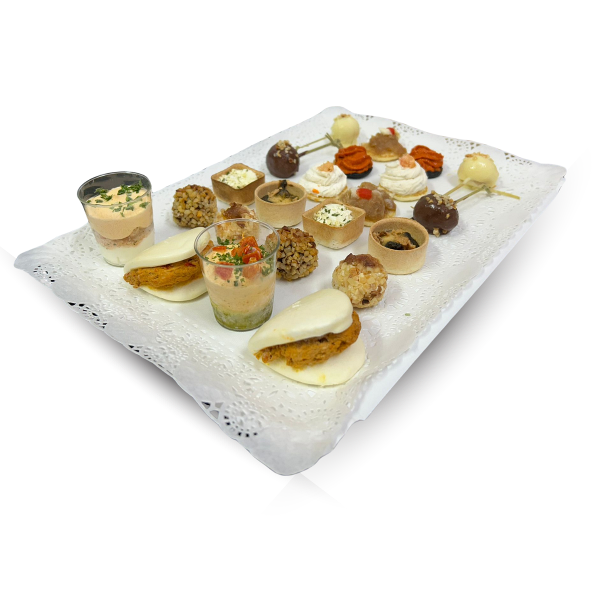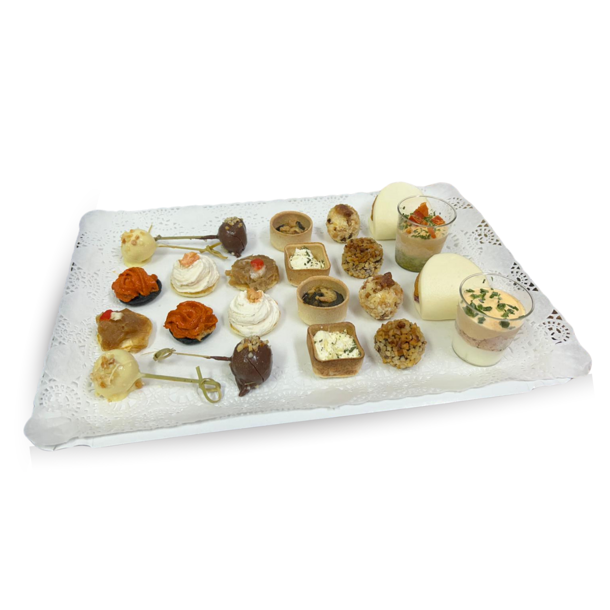 2 Pan bao de carrillada de cerdo con quinchea 2 Vasitos de foie de pato con cebolla caramelizada 2 Ferreros de morcilla, queso y crocant 2 Bombones de queso de cabra, higo y almendra 4 Tartaletas crujientes 3 blinis de crema de sobrasada con anchoa 3 blinis de crema de queso y salmón ahumado 4 Cake pop de foie y chocolate