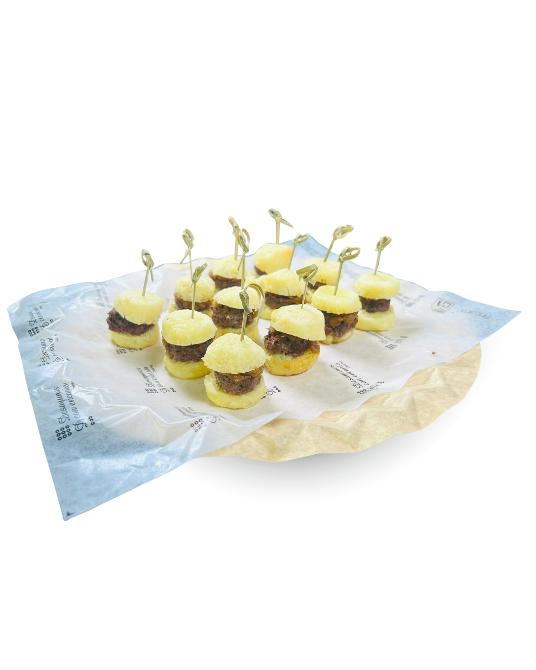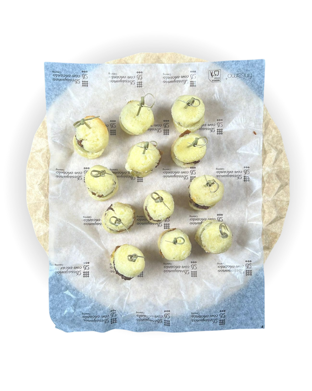Descubre el sabor único de nuestro mini panecillo de yuca, relleno de una deliciosa burguer vegetal y cebolla caramelizada. Una opción vegetariana y gourmet para el catering de tus eventos, incluye 12 unidades.
