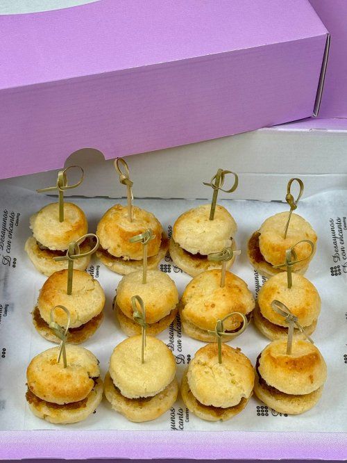 Descubre el sabor único de nuestro mini panecillo de yuca, relleno de una deliciosa burguer vegetal y cebolla caramelizada. Una opción vegetariana y gourmet para el catering de tus eventos, incluye 12 unidades.