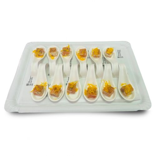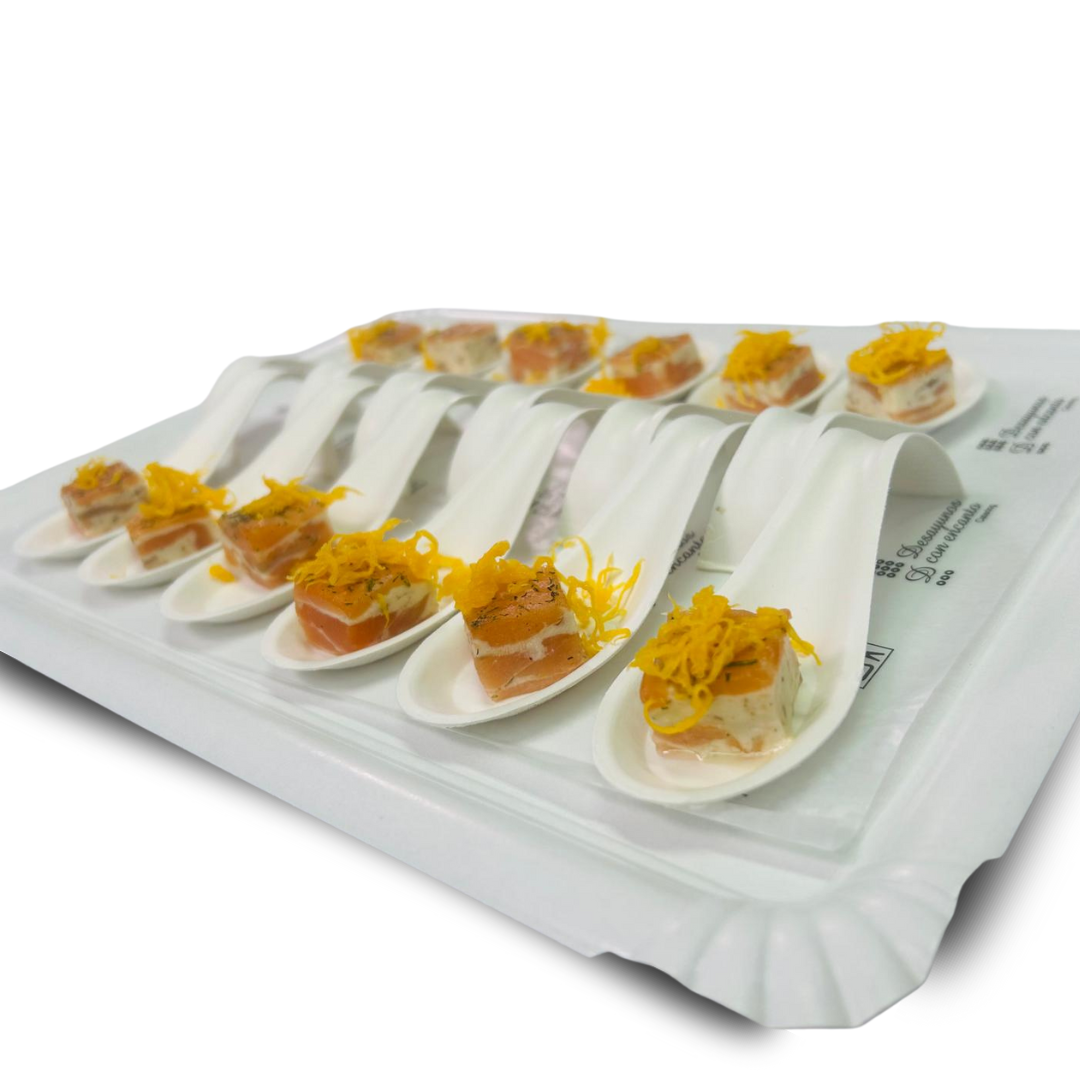 Nuestras 12 Cucharitas de Mini Milhoja de Salmón con Huevo Hilado son la definición de un aperitivo sofisticado. Diseñado para ofrecer una combinación exquisita de texturas y sabores en un solo bocado. Este delicado plato se compone de capas de una base crujiente, intercaladas con una suave crema de queso o similar, láminas de salmón ahumado de la más alta calidad y un toque final de huevo hilado que aporta color y dulzura. Su formato en cucharita es ideal para cócteles y eventos que requieren máxima elegancia y comodidad.