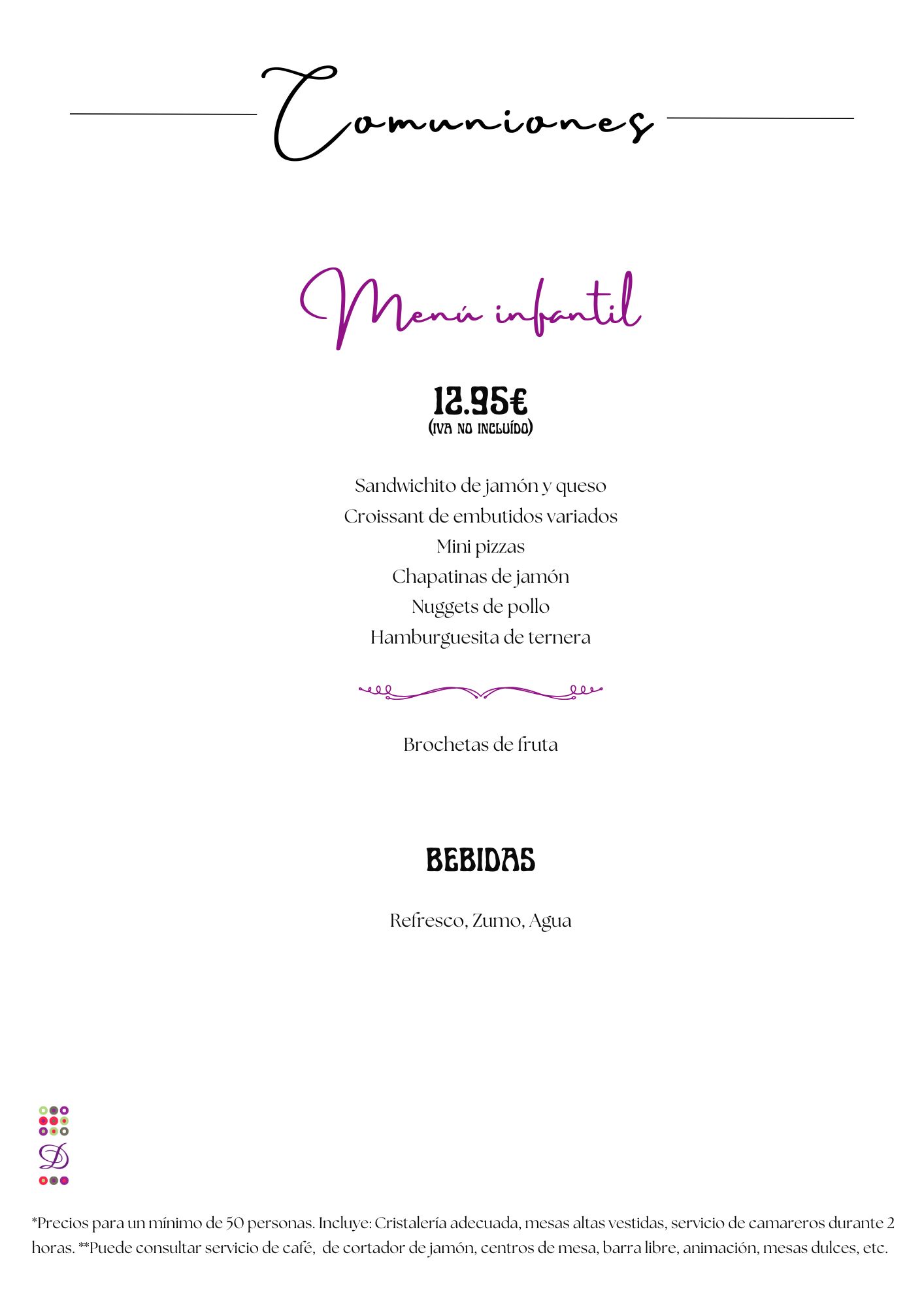 Nuestro servicio integral de catering para comuniones ofrece una selección de MENÚS en modalidad de sentado o de pié, tipo cóctel, elaborado con ingredientes frescos y de primera calidad. Este servicio incluye camareros durante dos o tres horas, mobiliario vestido y menaje adaptado.